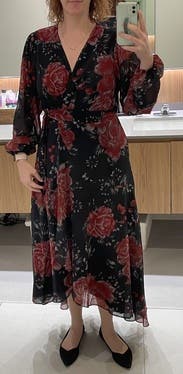 I didn't actually wear this dress. I got it as a back up. I'm a size 12, but sometimes a "small" size 12, so I got the L. It looked like a bathrobe on me and since I'm 5'5" it was ankle length on me, not midi length like on the model. It also is a wrap dress, with a low-cut V neck that seems easy to flip open. Not a good look for me ...