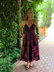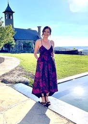 Love. This. Dress!! It was so fun, color & pattern are fantastic. I received so many compliments & felt so beautiful in this fun fun dress. Loved the pockets, perfect to stash my phone for pics all night. High low cut made it fun to dance in. It was light weight & perfect for a late summer evening wedding. Straps are pretty thin, at the end of the night they were digging into the shoulders a bit. It is very low cut, I've never worn a dress with this much exposure but I would rent this again!