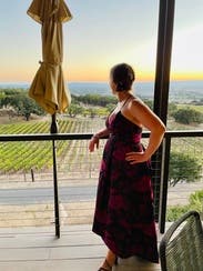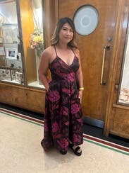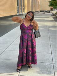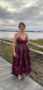 I wore this to a wedding in Florida and loved it. I got so many compliments. It stayed in place when I was dancing and has pockets. The fabric was a bit heavy and warm for the weather, and the straps dug in a little, but I wouldn’t hesitate to rent it again.