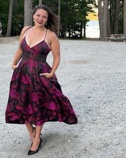 This dress was comfortable, great fabric, has pockets, great color, adjustable straps, enough said! It was perfect for the fall black tie optional wedding I attended in rural Maine. The asymmetric hem line was great for my short frame!