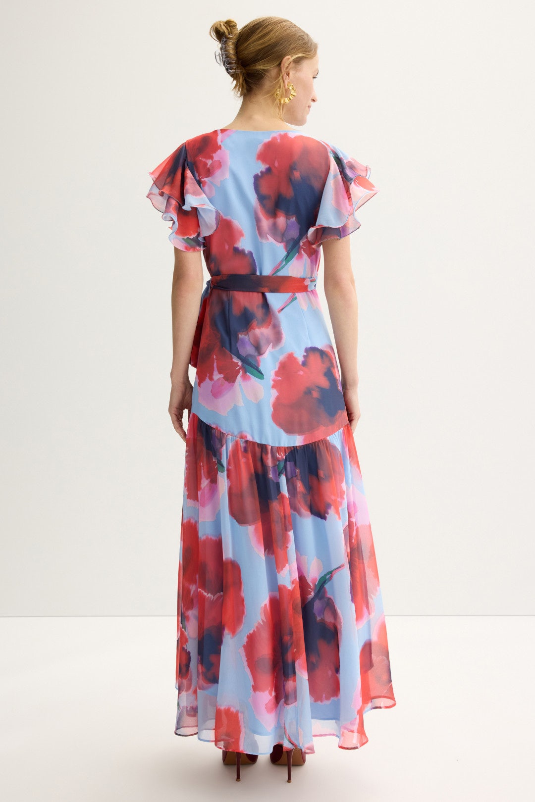 The Floral Zola Dress by Hutch is a vibrant wrap dress adorned with red blooms and fluttery short sleeves, ideal for sun-drenched days. Pair it with nude sandals and a straw tote for a breezy, effortless look.