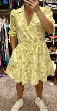 Yellow linen blend (54% Linen, 45% Rayon). Casual dress. Short sleeves. Collared. Front button closure. 36.5" from shoulder to hemline. Imported.
