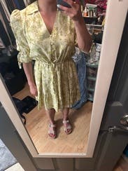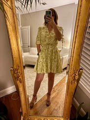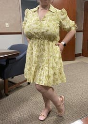 Such a cute dress! It is soft and comfortable while still being good for work. I feel like this is a very versatile dress that would be cute with sandals or heels. In person the color is a little more green and the fit is a little loose.