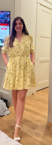 Absolutely loooooved this dress. Wore for a casual night out on vacation and a travel day that had multiple stops.. but could be worn for a luncheon/summer dinner. Comfortable, pockets, drawstring waist can change shape of the dress. Got a ton of compliments. When I order again, I'll go down to the small, but medium was still a good size! It has a slight weight to it, so phone in the pocket pulls it down. Not in an offensive way, just for reference.