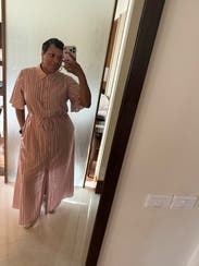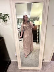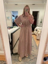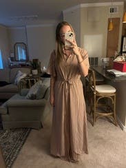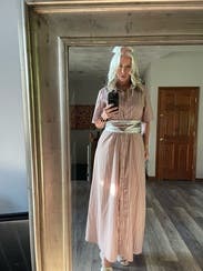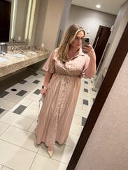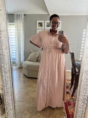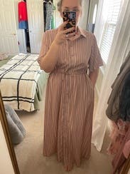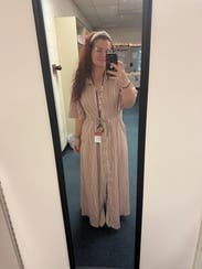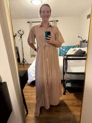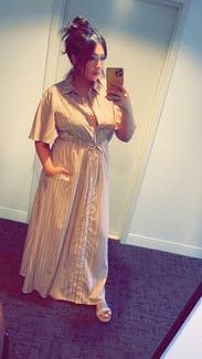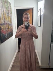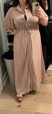 This dress was good not great for me. It’s nice fabric with a flowy cut which I liked. I liked the sleeves having some volume too. Issue was it was too small in the chest for me so I had to wear a cami underneath. I am larger chested (38DD) so not uncommon for button down fronts to not fit great. But just keep that in mind if you rent with larger chest. Did get several compliments!
