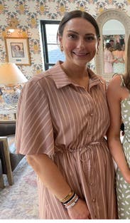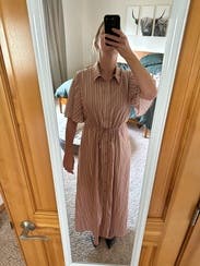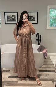 Beautiful striped dress perfect for multiple occasions. Easy to wear and cinches nicely at the waist. The dress is double lined too. If you work in a more casual office environment this would be great, i could. also envision this on vacation or running errands around the city. Very lightweight and airy. If you're smaller than my dimensions and height you might find that its too much fabric.