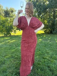 The color is more rusty than true red which I loved. I pinned the front as it was a bit to deep for my taste. I wore an 8, perfect length.
