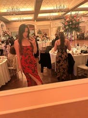 The dress was very comfortable. The slit was just sexy enough without making you feel like you were always adjusting yourself. I ended up wearing a low cut strapless bodysuit that gave just the right amount of lift without squishing the gals together too much. The straps were a bit long and often fell, but that's the only complaint.