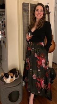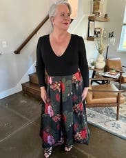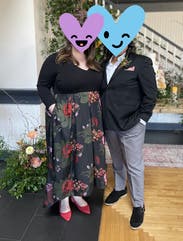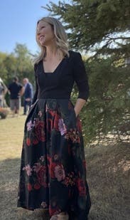Wore this for a friend’s wedding. I loved this dress! The material is a bit heavy, but gives the skirt a perfect twirl. The material and pockets made this dress so comfortable. I will do anything to avoid heels, and the wedding venue was indoor/outdoor. I paired the dress with a pair of red pointed Rothy’s and got a ton of compliments on the look. I would recommend sizing down, the dress runs slightly large.