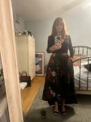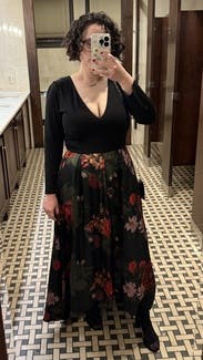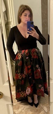 This dress stretches in all the right places and fit great! The weight and detail of the skirt is gorgeous. The pockets are so handy. No issues with back zipper, but helps to have someone else zip it up. Don’t need to unzip to use the bathroom. Definitely need to wear a 2” heel or more or the back will drag on the floor. I love how easy RTR makes the process of receiving and returning the dresses. Fantastic!