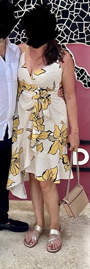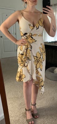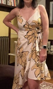 I was skeptical that I would love a wrap dress as much as I did, but this made me feel great! The wrap is generous enough that I had no problem with peeking bra syndrome, and it was loose enough to be forgiving on the midsection. I did wear a light shaping spanx for confidence. Asymmetric hem is sexy but not too high. Great for the 90 degree outdoors wedding we went to! Adjustable straps. Nonstop compliments all night!