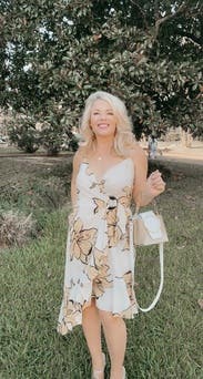 This dress was so flattering. It is more of a light beige base than ivory and is a true wrap dress with adjustable straps. I think this could be adjusted to fit any body type. I added the jean jacket for a cool evening and it was a great summer look!