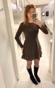 A little shorter than I would buy, but fun with black tights. Easy to wear, easy to pack, and super comfortable. I found that it ran true to size and and sparkle was perfectly appropriate for a 'dressed up casual' evening. I tried on the 8 and it fit great, though I probably could have gotten away with the 6 in hindsight!