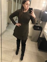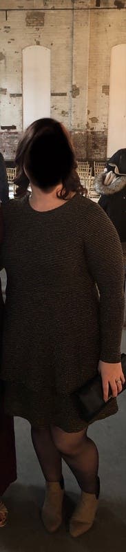 This dress surprised me when I opened the box. It looked green in the pictures but is actually black with gold, sparkly stripes. At first I thought it might be too dressy for work, but I decided to wear it anyway. I dressed it down with black flat boots and low-key makeup/accessories, and I ended up getting SO MANY compliments on it! Perfect fit, very flattering silhouette. Would rent again, especially for a holiday party or special occasion.