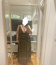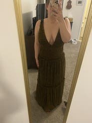 Im usually a size 10 in dresses but I sized down about 4 sizes (to a 6) and really believe I could have gotten a size 2 and fit into the dress. It’s a super beautiful dress, but definitely runs on the larger side. It’s is also supposed to have that semi flowy look. I was afraid to wear it because the 6 was still too big so the top/straps were falling. Size down and you should be fine!
