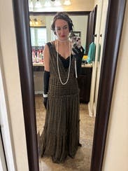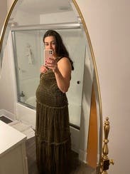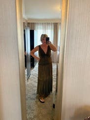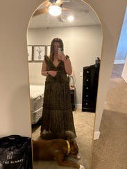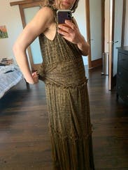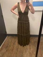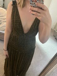 I rented this as a backup dress for a gala. I am 22 weeks pregnant so I thought the stretchy material would be helpful. It however ran 2 sizes too big, even for a pregnant person. The neckline is also very revealing, even a safety pin wouldn't help too much. It's a shame because it's beautiful but definitely not a winner for me.