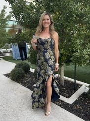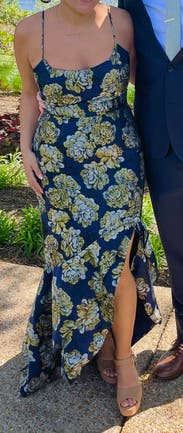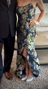 Such a flattering and gorgeous dress! Rented it for a charity gala and I felt like a star! Thick brocade fabric with beautiful floral designs. Some folks complained about straps being too long but I thought they were fine. Slit was perfect balance of drama and class!