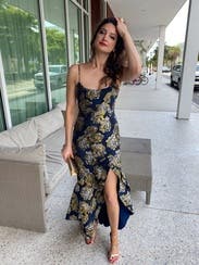 Loved this dress, it has great structure and although it isn't forgiving, the slit helps with movement. The navy and gold pop so perfectly. I added gold shoes and gold statement earrings. I wore a bra, but prob didn't need to. Note- I have long legs abs a short torso so this dress worked well with my body shape.