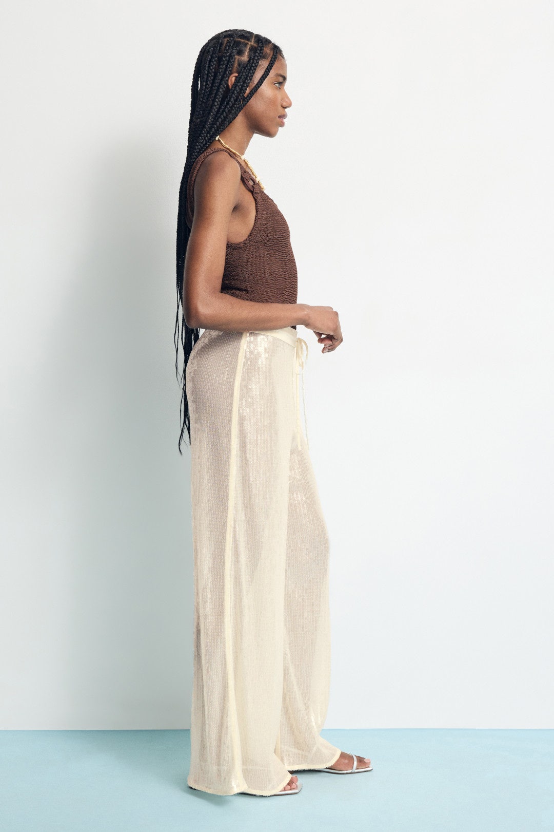 Off-white sequins (100% Polyester). Pants. Pull on. Inseam: 30". Rise: 12". Leg opening: 15.5". Imported.