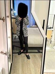 Wear something tighter inside - shirt skirt or tight slacks to pair this slightly looser jacket with