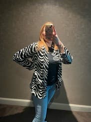 Runs a tad oversized but looks great over a form fitting dress. This blazer gets a lot of attention and is so fun!