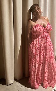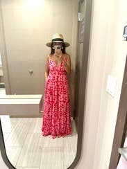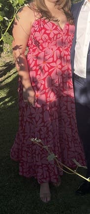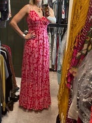 This dress is beautiful and super airy in the best way. Got tons of compliments while wearing it. The reviews were right that the chest area is very large - even being as chesty as I am it was very loose and provided zero support for the girls. I would size down if I rented this again. It was the perfect length on me though so that was a win! Plus the color and pattern is so beautiful!