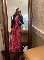 I loved this dress! So colorful and comfortable - wore without a bra but I am a D cup. I thought I’d be pulling it up all night but the weight of the dress actually helps it stay put and not reveal too much! It ran just a little large, but for a maxi I didn’t mind at all. Definitely a winner! Oh, I wore with wedges here because I’m flip flops, the dress was dragging on the ground and I was tripping. I’m 5’4” so anyone taller than 5’6” probably wouldn’t have a problem with length.