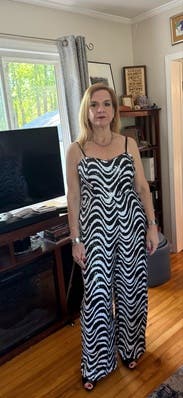 I don’t want to say I upstaged the bride in this but….. I got compliments all night. Pros- The sequins don’t rub anywhere uncomfortable. It has pockets on the jacket and the jumpsuit. Sturdy zipper. Didn’t need a bra. Straps are adjustable. Cons- the waist section was a bit roomy so it wasn’t as form fitting as some other jumpsuits out there. The straps aren’t very cute, they’re just strings. So a jacket is needed.