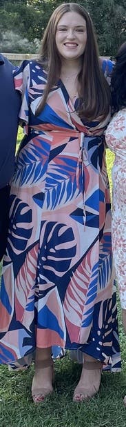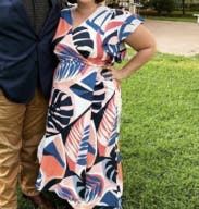 I got so many compliments on this dress! It is a true wrap dress so I was able to adjust it and didn't have any issues with it coming untied. The only issue I had was some gapping at the bust, but this was fixed with a small safety pin.