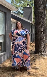 The wrap around tie sat nicely at my bra line, making for a very flattering fit. The length ensured it was flowy and the slit was never a challenge, even while dancing. I 100% would rent this dress again for another wedding.