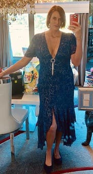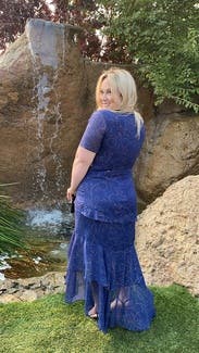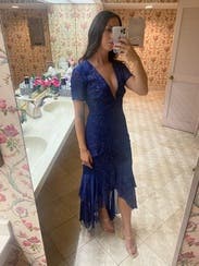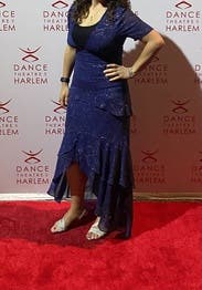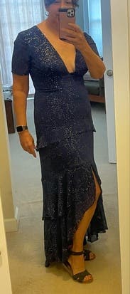 I can see myself renting this dress again. I loved it. The royal blue color is fabulous. The gold specs are beautiful and take the dress from great to stunning. Love the short sleeve and v neck cut. It's very flattering for curvy Apple shapes like myself. I will say it's very daring to wear for large breasted women. In some of the other reviews I noticed it looked much more tasteful on flatter women. I bought boob tape to help but I didn't end up using it. You won't be able to wear a bra