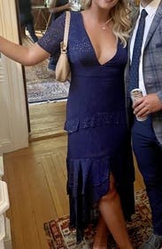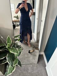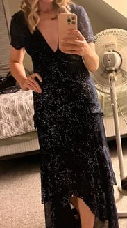 This dress is very pretty and flattering! But as others have said, it is very low cut, so I used a pin at the bottom to close it a little. And one thing that I haven’t seen mentioned is that there is zero padding in the boob area, so unless you want your nips poking through all night you’ll need to figure something out. I ended up taking pads out of a bra and sticking them in the dress, which worked ok. But the slight sparkle and high low hem make this dress so pretty. Even though there is some effort needed, I would recommend this dress!