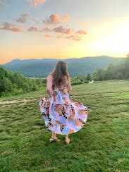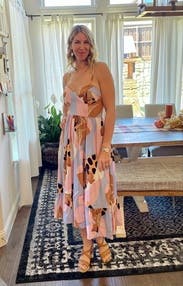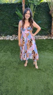I had some very specific needs when looking for this dress. It was for a friend's summer/fall wedding in LA- so I wanted something airy and light. My husband was in the wedding wearing a blue gray suit, so I didn't want to matchy match him, but also didn't want to clash. When I saw this dress, I knew it was outside of my comfort zone (I pretty much only wear black) but it was gorgeous, matched everything I wanted, and had great reviews. Well when it arrived, I was so happy with it. It's even more stunning in person, the straps are adjustable on top, it has pockets, and it flows beautifully. I'm usually pretty right in the middle of size 8 and 10, but was easily able to fit in the 8. I wouldn't have wanted to go any smaller than that though. I am currently very flat chested, post breastfeeding, so that's the only thing I struggled with in this dress. A strapless bra showed beyond the cup line and looked strange, and without a bra I was so flat. I ended up trying boob tape for the first time, which gave me just a little bit of cleavage and worked great in the dress. Overall 10 out of 10, and I can't wait to find another reason to rent this dress- or I might just have to buy it!
