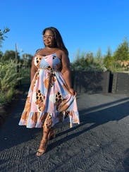 I mostly got this dress because of how great it looks on other reviewers. Wore this to a semi-formal 5:30PM, August wedding & I’m happy I chose this fabric as I was not sweating to death. I did add a gold chain belt to the dress to make it “pop” some more and give my body a bit more shape, but I was flooded with compliments. Also, I’m not a fan of pre-shaped boob cuts yet with the right strapless bra you don’t notice. I had originally ordered the size 16, but the chest area was wayyyy too snug and I’m happy that the size 18W didn’t make me feel like a tent. I would DEFINITELY wear this dress again.
