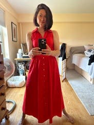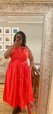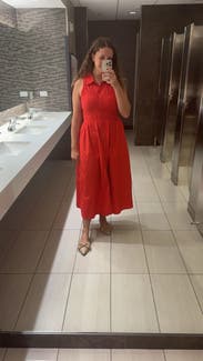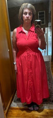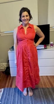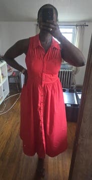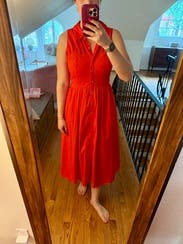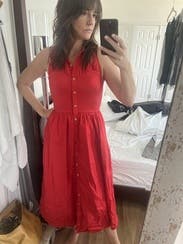 Got a lot of compliments on this one. Fit well on me but would size up since the top was a little tight. I like that the buttons aren’t “real” to avoid gaping. Only qualm is the skirt is unnecessarily lined which doesn’t help when it’s really hot out