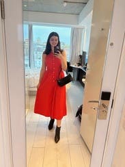 I LOVED this dress. The cut of the top was flirty/youthful. Paired with the length, it was the perfect office fit. One thing I didn’t realize until rented was that the dress actually has a full back zipper that goes all the way to the top of the neck. The color was a bit brighter but I loved it. I think it would be perfect for spring, summer or an early transition into fall. Will definitely rent again!