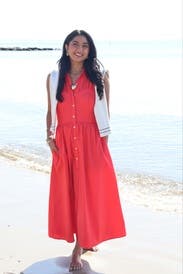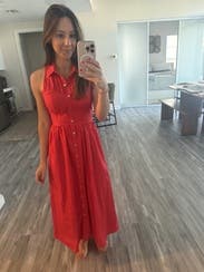 Red (100% Cotton) Casual Dresses. Collared neck. Sleeveless. Back zipper closure. Shoulder to hemline length: 51.5". Imported.