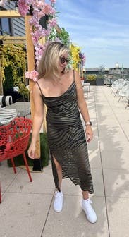 This dress is sheer (pun intended) perfection. I was comfortable all night, from dinner to dancing. The print, cowl neck, and length lended modesty while the high-cut slit gave it a fun flair. I received compliments all night. As a curvy girl, I shy away from dresses with this silhouette, but I'm so glad I gave this one a go. My only wish is that I had another occasion to wear it!