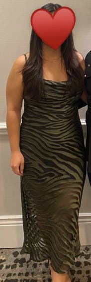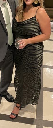 The dress was perfect for a cocktail attire fall wedding. I’m 5’6” and the slip of the dress was a little short in the back. If there was nothing overtop, I would not have been able to wear it. The slip sat a little funny in general. I didn’t wear a bra with this dress, but the top wasn’t fully lined at the bust so that may not work for everyone. Lastly, the straps and top I had some issue adjusting. Dress worked well for the occasion, but I would not rent again