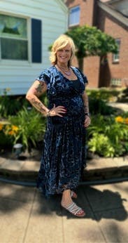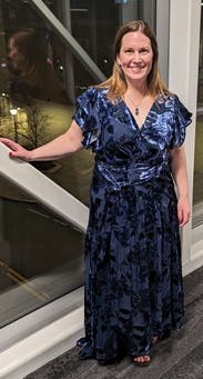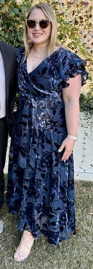 I really liked this dress. It’s a full wrap, so size can be customized around you. I get nervous about full wrap because of the risk of it coming open. These ties are very long and go around a couple of times. I’m very full up top so there was a gap when I sat down, but a couple of safety pins too care of that. Would wear again! It was perfect for a colon cancer awareness banquet!