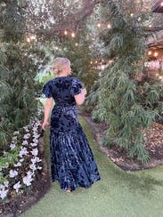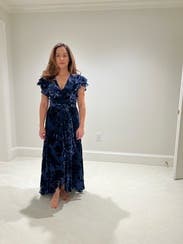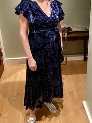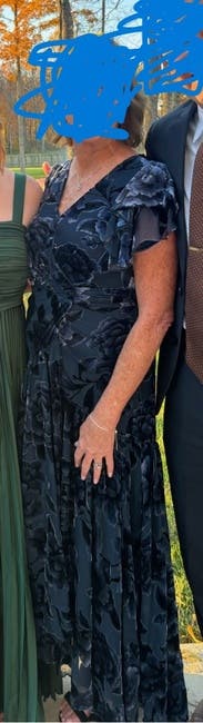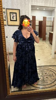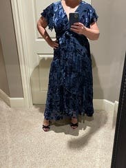 Beautiful velvet burnout floral wrap dress. Perfect for a fall or winter wedding. Medium fit but had to pin the neckline. Would have preferred the large for a bit more coverage, but that’s a personal preference.