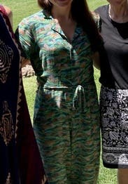 The material is thin but not see through, so it’s easy to wear in a 80-90 F tropical climate. It’s a fun pattern and flattering fit.