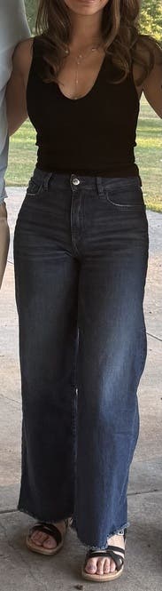 The dark wash is exactly what I was looking for, and as someone who is 5'2", I was thrilled that the long length grazed the floor perfectly. The high-waisted fit is incredibly flattering, and the soft, stretchy fabric makes them so comfortable to sit in all day long. They're a definite win!