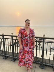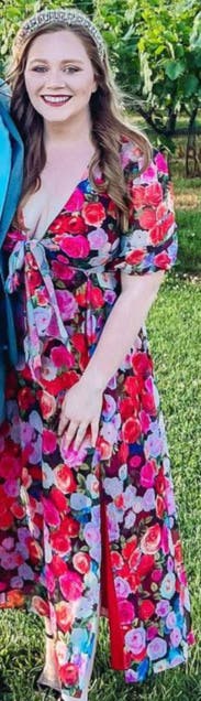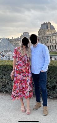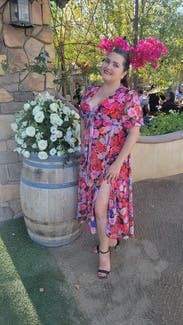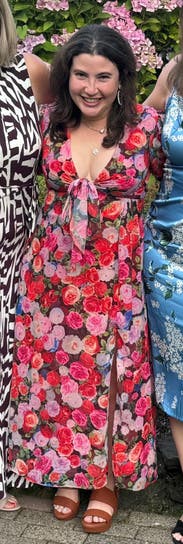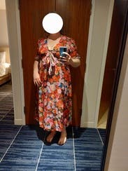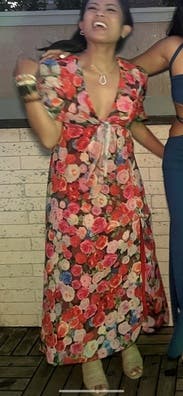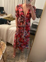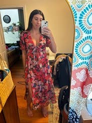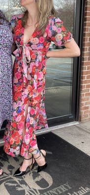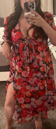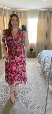 felt so cute in this dress, originally rented for a wedding that I wasn’t able to make it too but ended up wearing it out to dinner. loved the floral print and the tie by the chest / leg slit felt just flirty enough! usually a 10 in dresses but sized up in case and was comfortable in a 12. didn’t wear a bra, the tie felt like to enough hold the girls together!