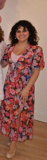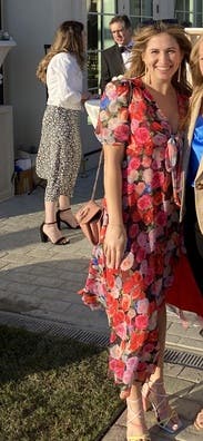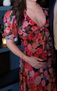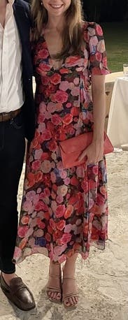 I wore this to host my sister’s bridal shower and I just loved it. The low neckline and leg slit are playful without being overly sexy, and the print is so fun and versatile. It was also roomy enough for me to enjoy all 3 courses of the lunch. Highly recommend!