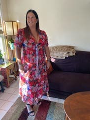 I typically wear a size 6 but went up at 10 weeks pregnant for a roomier fit. It has a lot of fabric but I loved the flowy feel and floral design.