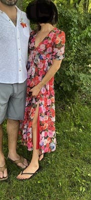 I felt super pretty and feminine in this dress. The colors are beautiful and it's very comfortable. You can eat and dance away because is flowy. The neckline is deep but I did not mind it because the rest of the dress is pretty covered up. Perfect for the outdoor wedding I attended. People kept on complimenting the dress and it photographs great.