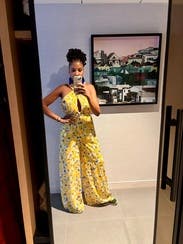 Yellow printed polyester (100% Polyester). Jumpsuit. Halter neck. Sleeveless. Back zipper closure. 58" from shoulder to hemline. Imported.