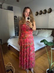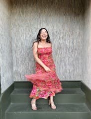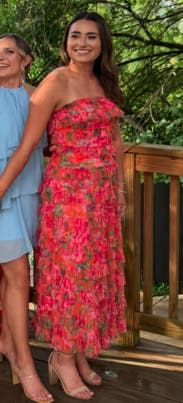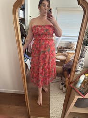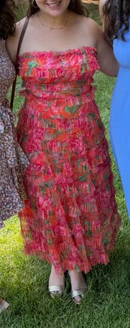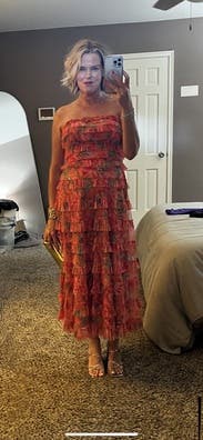 I am OBSESSED with this dress. If I could buy it and keep it, I would! Wore to a wedding with “elevated garden party” dress code. When I tell you I felt like an It Girl for maybe the first time ever… this dress is everything. Fits TTS but it definitely is roomy in the chest (has molded cups)—was perfect for my 34Fs and could accommodate bigger too! The bodice has boning which gives great structure, and the fabric is SO light and comfy. This dress weighs next to nothing and was SO comfortable, not a scratchy material at all, more like soft mesh. It’s fully lined and the outer mesh ruffle skirt is fun to swish around on the dance floor. I got compliments all night long, felt super cute, and was comfortable. What more could you want?! I’m 165 5’7 34F and I wore the 8.