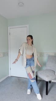 This is such a cute oversized jacket. It can work well with short or long sleeve shirts. The waist does bunch up quite a bit, but the poofy shoulder is awesome. It is THICK fabric! If you are not in cool weather, you may sweat. It is surprisingly warm!